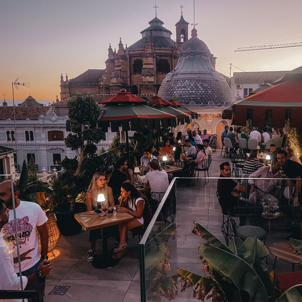 Un bar situado en la azotea del Hotel Palacio Gran Vía con vistas de 360º tanto a la Catedral como a la Alhambra, perfecto para tomar un cocktail a la caída del sol con buen ambiente, buena música y una decoración preciosa: sombrillas de colores, cojines exóticos, zona chill out con hamacas… no os lo perdáis!