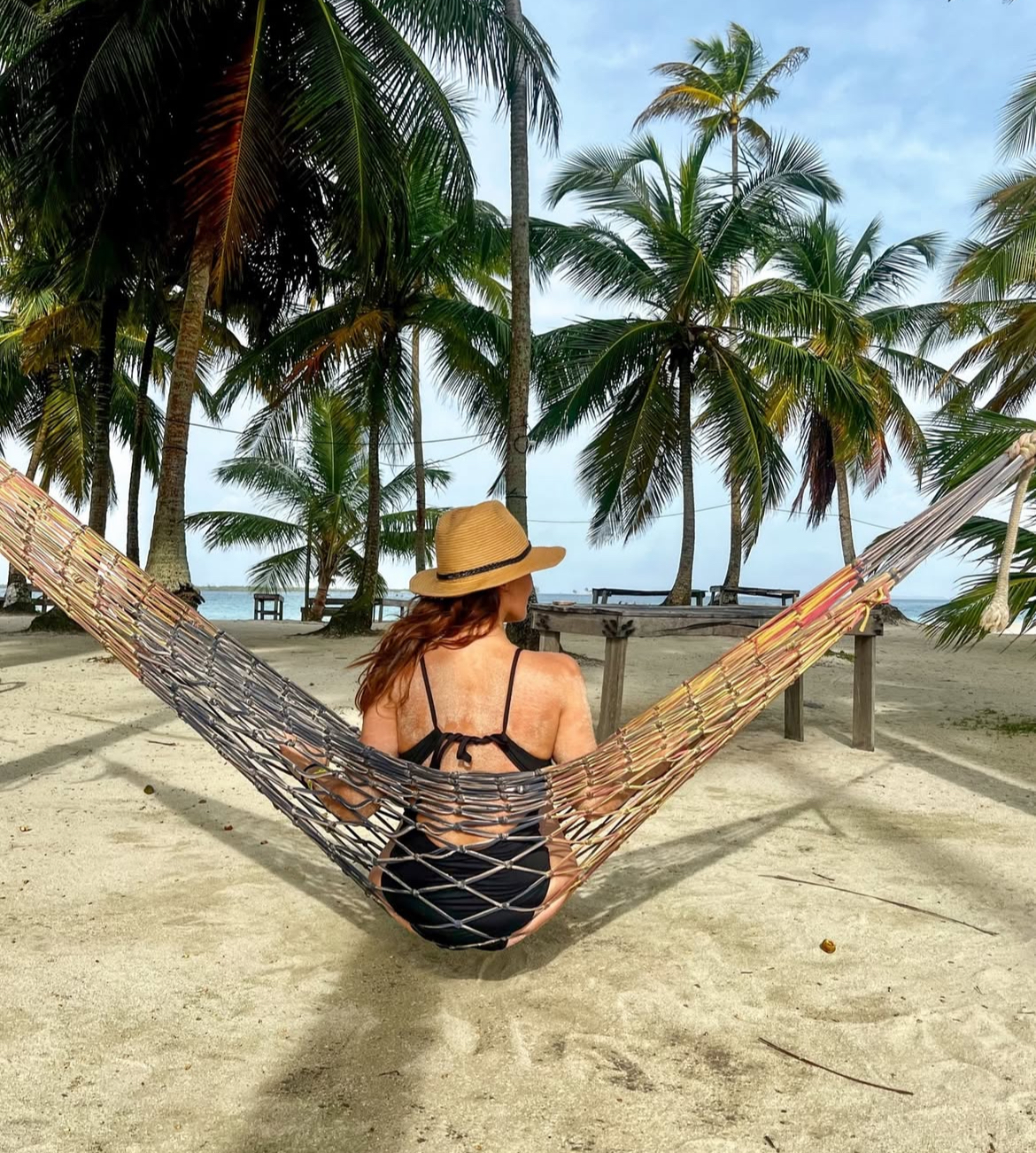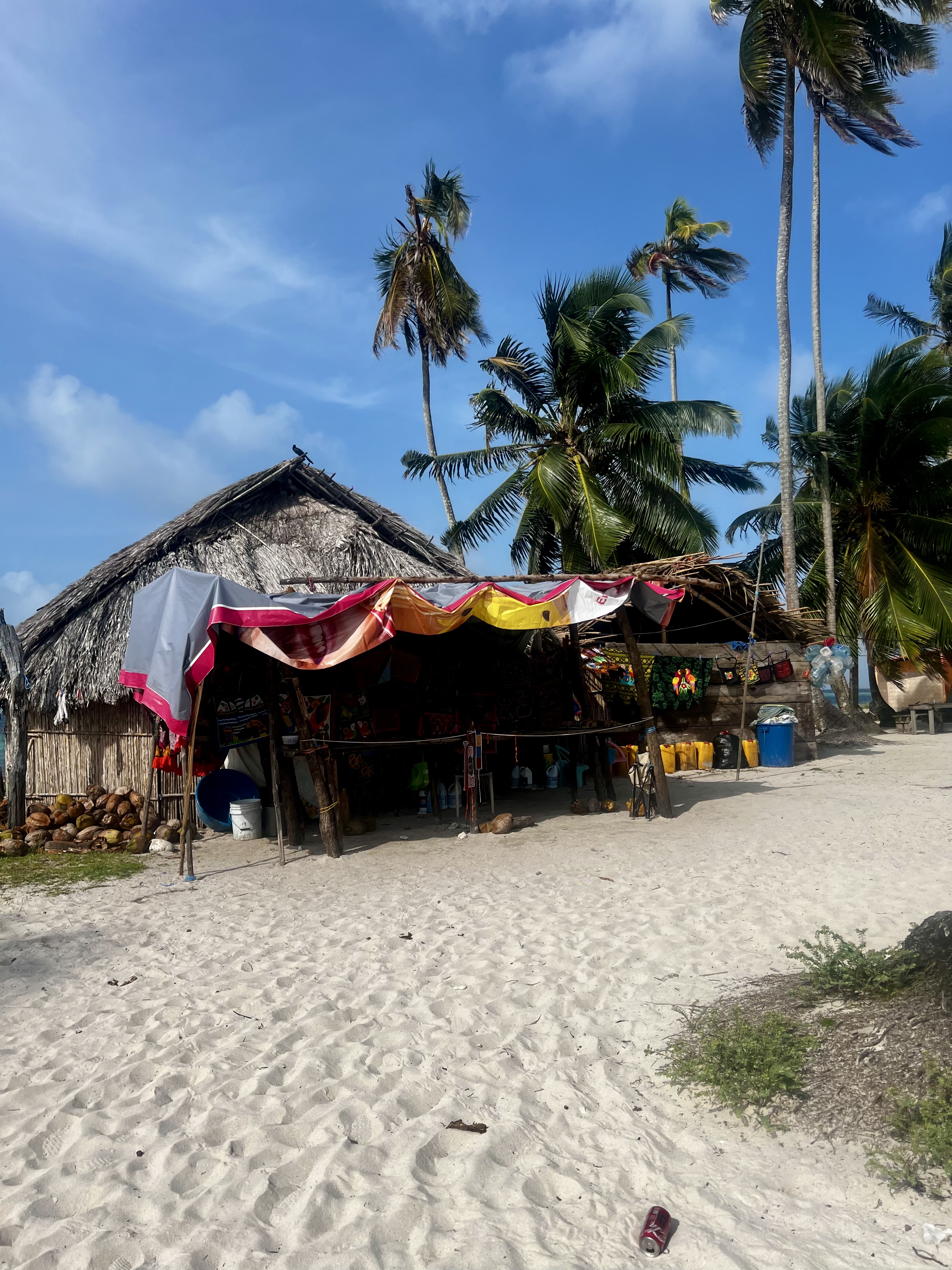 Another thing we looked at was size: the island was small enough to make you feel lost in the world, but it had several distinct areas, hammocks hanging from palm trees, and you could take short walks to discover its different beaches… It also had a small Guna craft stall with molas (colourful hand-sewn fabric panels), wood carvings, paintings… and a simple, picturesque cocktail bar that was perfect for enjoying the sunset with a cocktail or beer in hand.